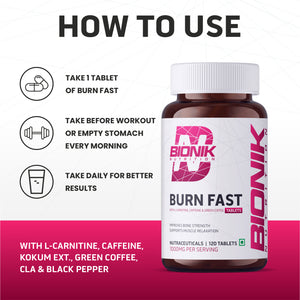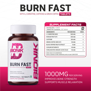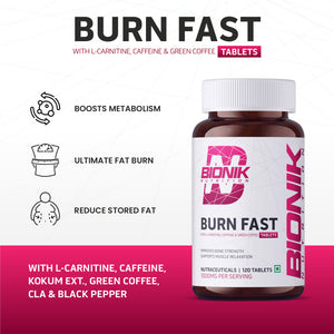 BIONIK NUTRITION Burn Fast Fat Burner Tablets with L-Carnitine, Green Coffee, Caffeine & CLA | Metabolism & Energy Support Supplement | Weight Management Formula | 1000 mg per Serving | 120 Tablets